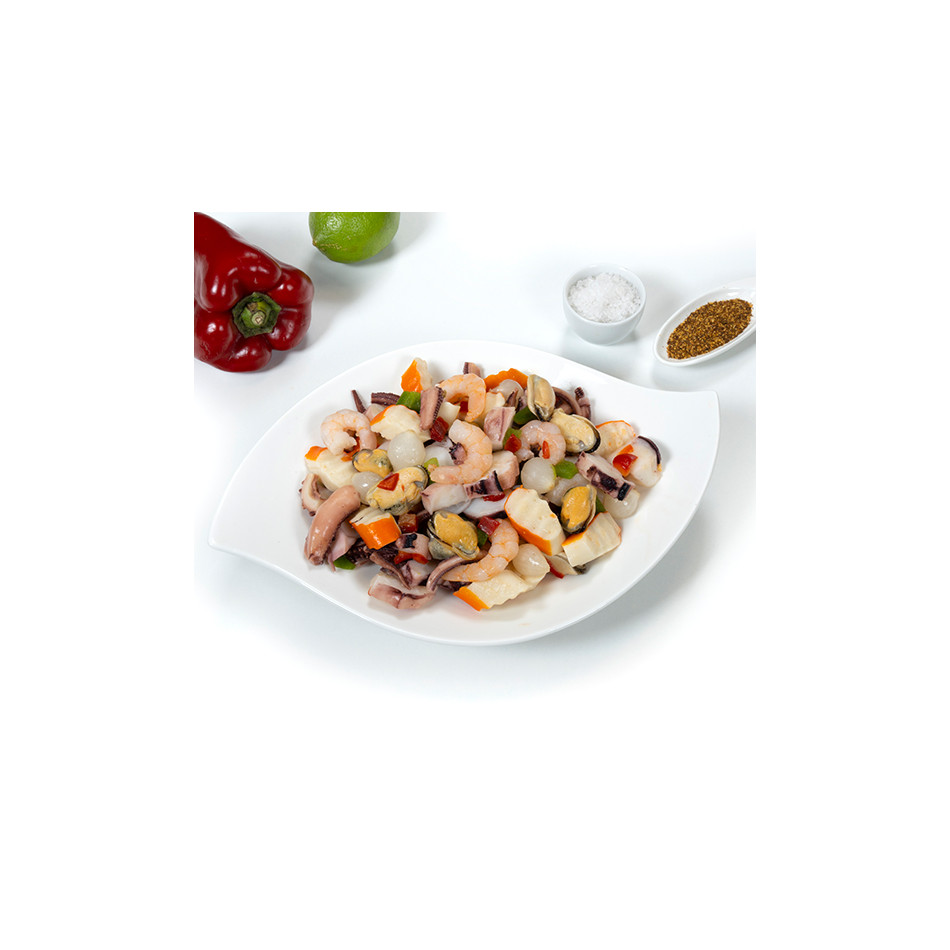 Rejos de potón cocido 30% (Dosidicus gigas ),sal, corrector de acidez(E330,E331),estabilizante (E500), Palitos del mar 20% (agua, 22% Surimi (carne de pescado,estabilizantes:E420.E450,E451, E452), clara de huevo rehidratada, almidón (contiene trigo sin gluten), aceite de nabina, proteína de soja, azúcar, sal, potenciador del sabor: E621, E631, E627;aroma, y colorante: E160c, E120) 10% Carne mejillón cocido (Mytilus chilensis ) 10%Langostino pelado cocido(Penaeus vanammei), sal,antioxidante(E223) y estabilizante, (E450,E451,E339)., 10% Cecollita perla, 10%Pimiento rojo, 10% Pimiento verde. ALÉRGENOS: CONTIENE: CRUSTÁCEOS, DIÓXIDO DE AZUFRE Y SULFITOS, MOLUSCOS, HUEVO, PESCADO Y SOJA.
