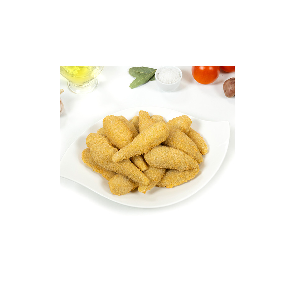 Relleno (59%): carne separada mecánicamente de pollo (61%), agua, copos de patata, proteína de soja , gluten de trigo , sal, harina de trigo , huevo en polvo, fibra de trigo , aroma, potenciadores del sabor (E 621, E 627, E 631). (Porcentajes calculados en base al relleno) . Empanado: pan rallado (harina de trigo , agua, sal, levadura), aceite de nabina, agua, preparado para rebozar [almidones (contiene trigo ), harina de trigo , gluten de trigo, sal, especias]. ALÉRGENOS: PUEDE CONTENER TRAZAS DE APIO, PESCADO, CRUSTÁCEOS, MOLUSCOS, MOSTAZA, LECHE Y FRUTOS DE CÁSCARA.