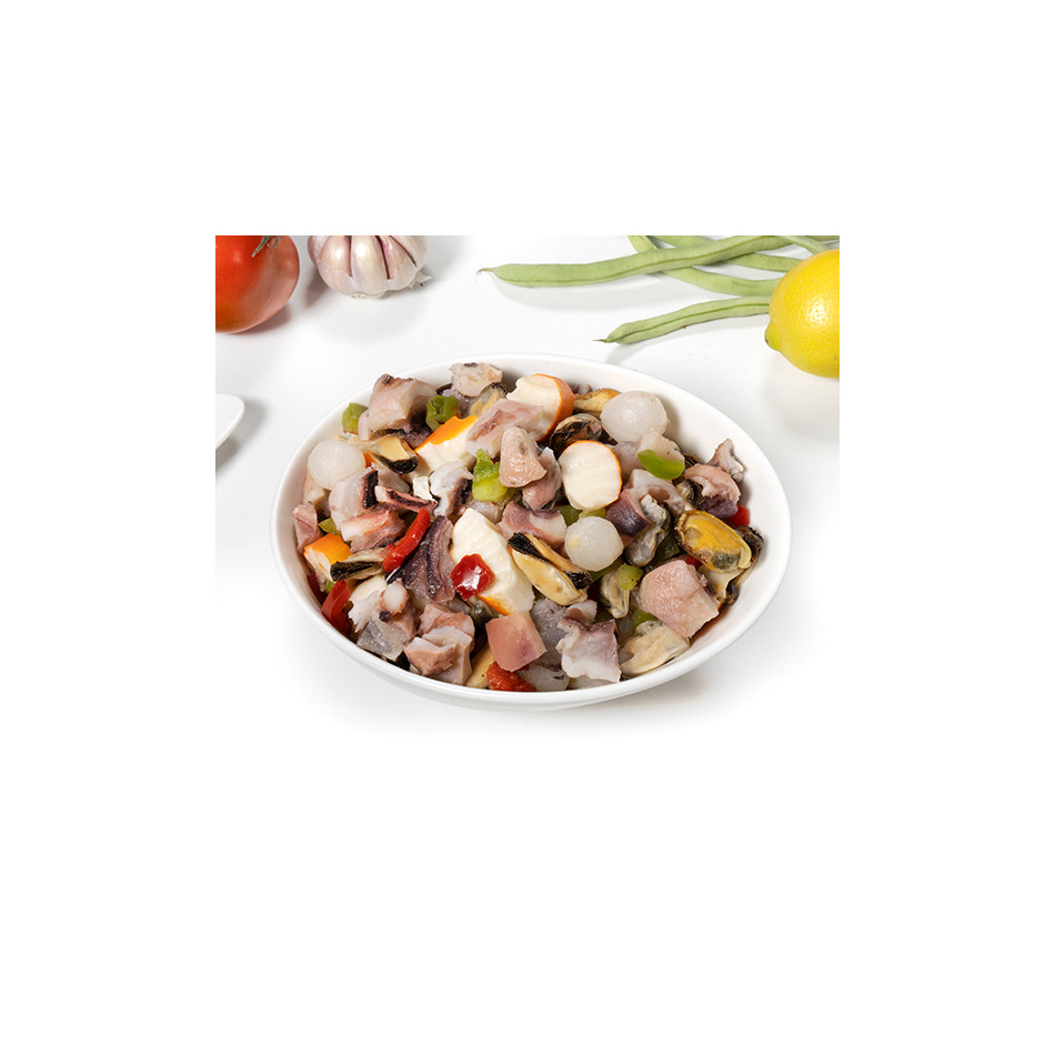 35% PULPO COCIDO (Octopus vulgaris ),sal, antioxidante(E-301), estabilizante(E-331) y maltodextrina, 20% PALITOS DE MAR (agua, 22% Surimi (carne de pescado,estabilizantes:E420.E450,E451,E452),