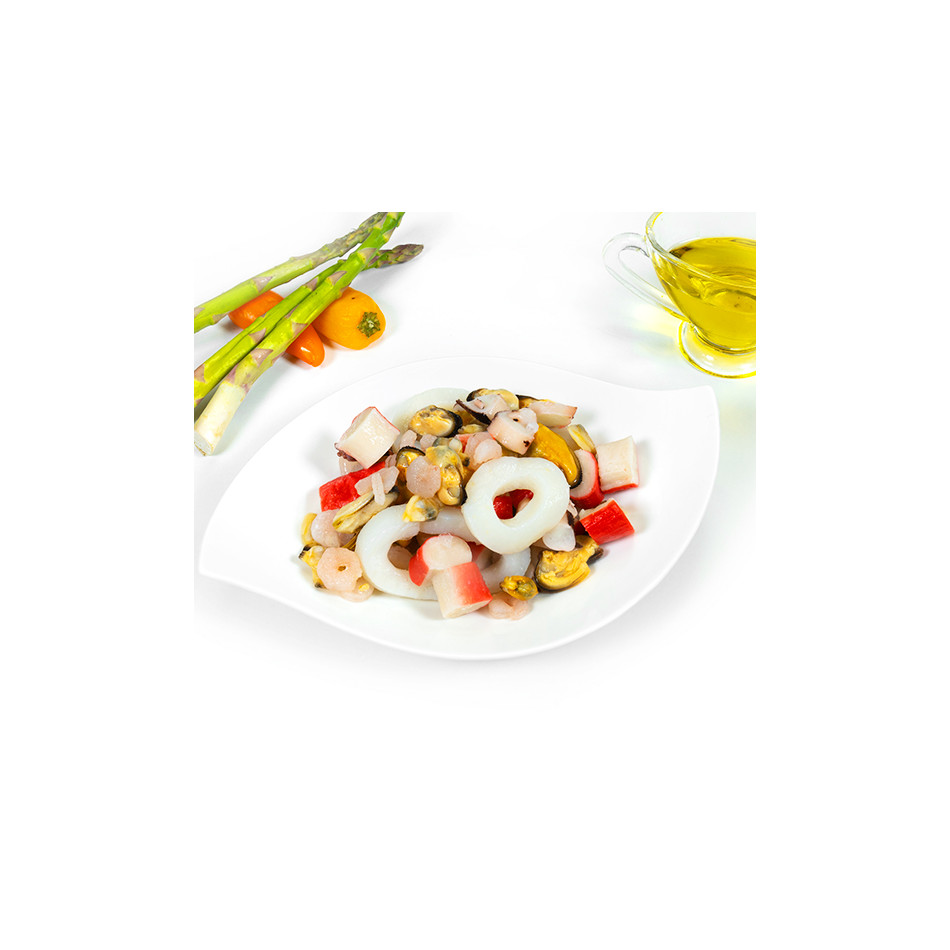 potenciador de sabor (E-621) y colorante (E-120, E-635)), rodaja de rejo, anilla volador (agua, sal, acidulante (E-330) y corrector de acidez (E-331))]. Marisco [gamba pelad(antioxidante (metabisulfito sódico, ácido cítrico, citratos de sodio y ácido ascórbico)), carne de mejillón (dextrosa, antioxidante (E-330)), carne de almeja] y agua. ALÉRGENOS: CONTIENE: CRUSTÁCEOS, PESCADO, MOLUSCOS, SULFITOS, HUEVO, GLUTEN Y SOJA.