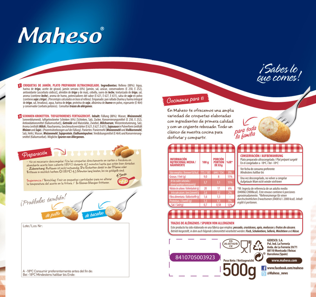 Relleno (88%): agua, harina de trigo , aceite vegetal (*), jamón serrano (6%) [jamón y/o paleta de cerdo, sal, azúcar, conservantes (E 250, E252), antioxidantes (E 301)], almidones (contiene trigo ), cebolla, suero de leche en polvo, texturizado de trigo [proteína de trigo , harina de trigo , colorante (E 150c)], sal, aroma, aroma de humo (contiene leche ), potenciadores del sabor (E 621, E 627, E 631), aroma natural, salsa de soja (soja , trigo , sal), maltodextrina. Porcentajes calculados en base al relleno . Empanado: pan rallado (harina y harina integral de trigo , salvado de trigo , agua, sal, levadura), agua, harina de trigo , proteína de soja , albúmina de huevo en polvo, espesante (E 464), conservador (sorbato potásico) ALÉRGENOS: PUEDE CONTENER TRAZAS DE APIO, PESCADO, CRUSTÁCEOS, MOLUSCOS, MOSTAZA Y FRUTOS DE CÁSCARA