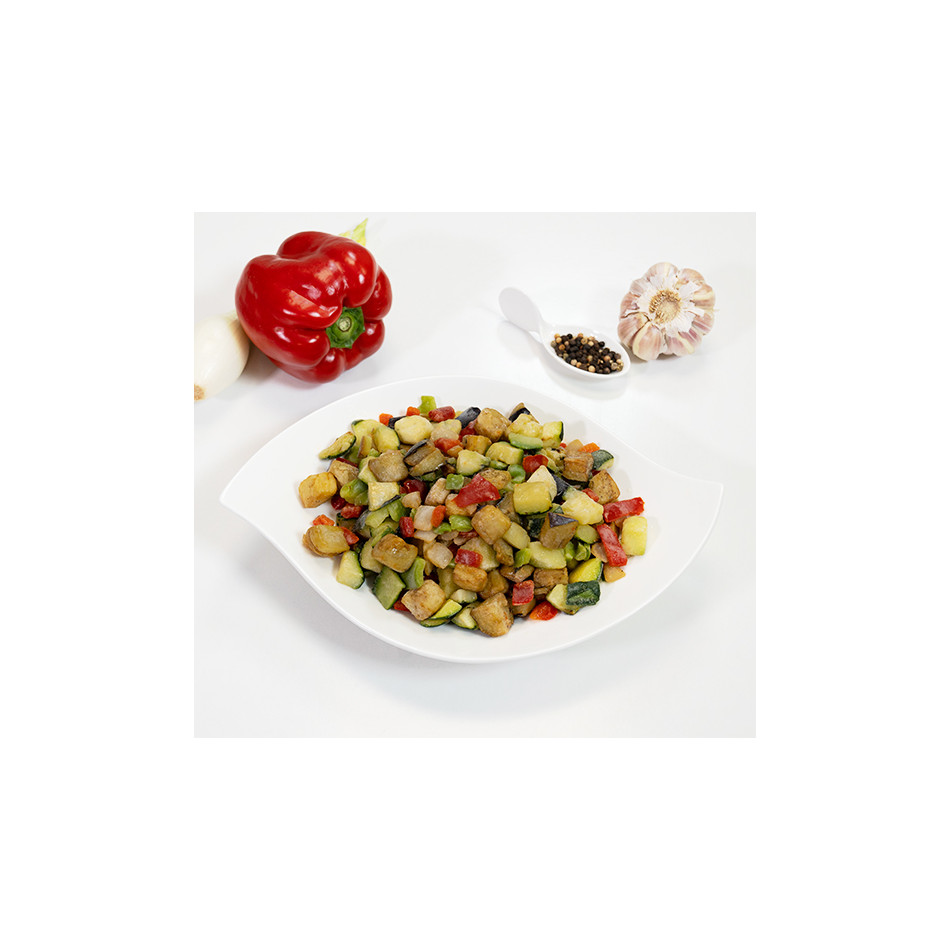 Berenjena frita cubos (aceite de girasol), calabacín asado, cebolla frita cubos,