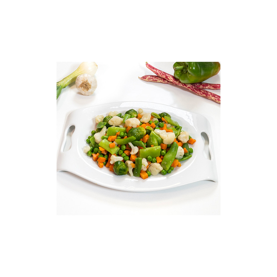Zanahoria cubos, judía verde plana, coliflor, guisante, coles de Bruxelas. ALÉRGENOS: PUEDE CONTENER TRAZAS DE SOJA Y APIO